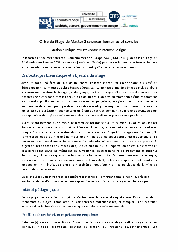 Le laboratoire Sociétés Acteurs et Gouvernement en Europe (SAGE, UMR 7363) propose un stage de 5 à 6 mois pour l’année 2026 (à partir de janvier ou février) portant sur les nouvelles formes de lutte et de coexistence entre les sociétés et le “moustique tigre” au sein de l’espace rhénan.